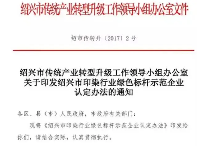根据《绍兴市印染行业绿色标杆示范企业标准》(绍市工转升〔2016〕2号)、《绍兴市印染行业绿色标杆示范企业认定办法》(绍市传转升〔2017〕2号)的要求,在各区、县(市)及市直开发区初审推荐的基础上,经现场评审和公示,第一批绍兴市印染行业绿色标杆示范企业出炉。